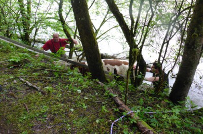 Gemeinsam mit Tierarzt Dr. Weissensteiner konnten die Kameraden der Feuerwehren Admont und Hall die Kuh, die sich nicht selbst über eine Böschung retten konnte, aus der Enns befreien und dem Eigentümer übergeben.