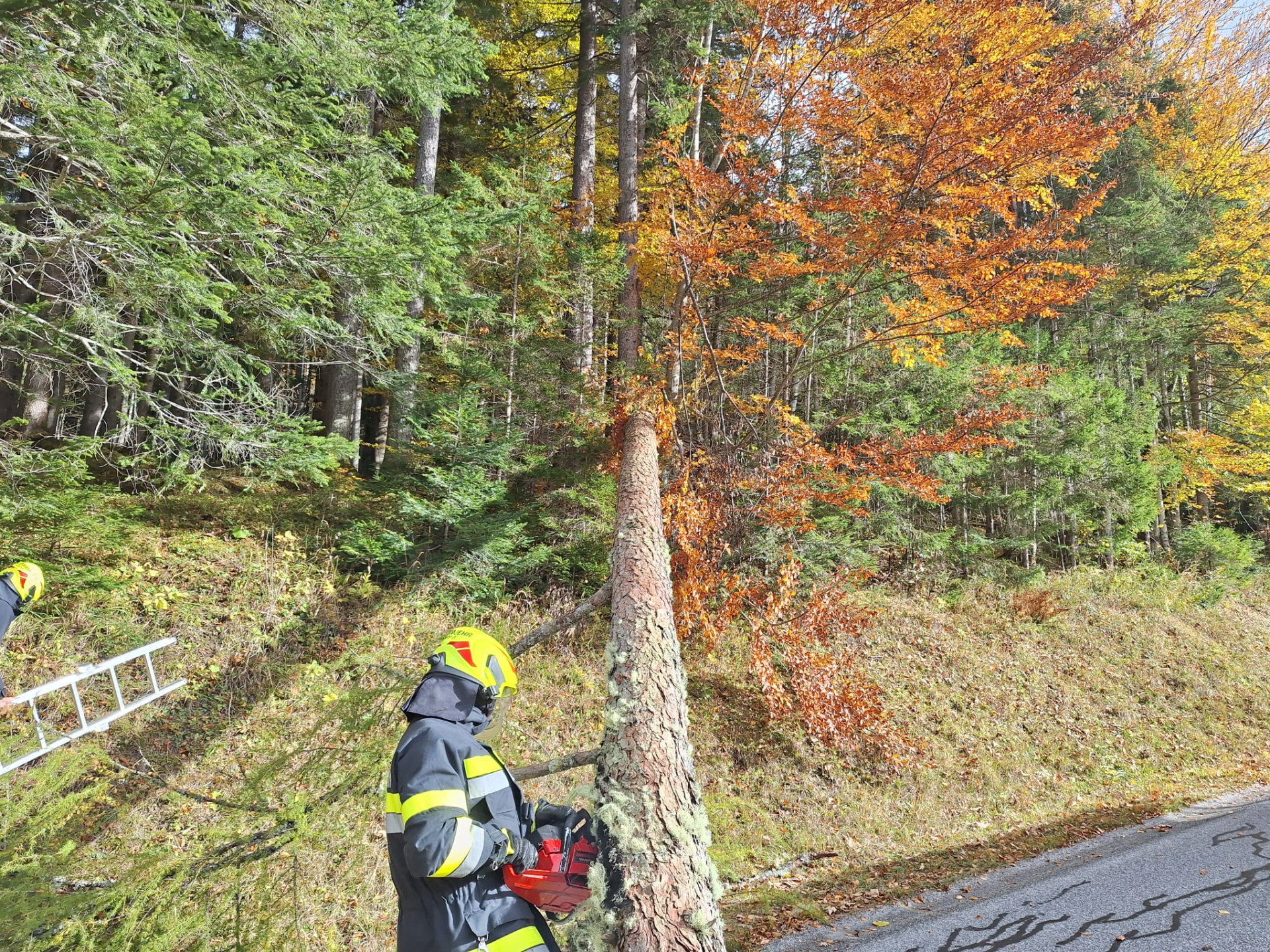 Am 23.10.2025 galt es die Kaiserauer Landesstraße von einem umgestürzten Baum freizuschneiden. eingesetzt waren: FF Admont mit RLF-A 2000 und 3 Personen, Straßenmeisterei