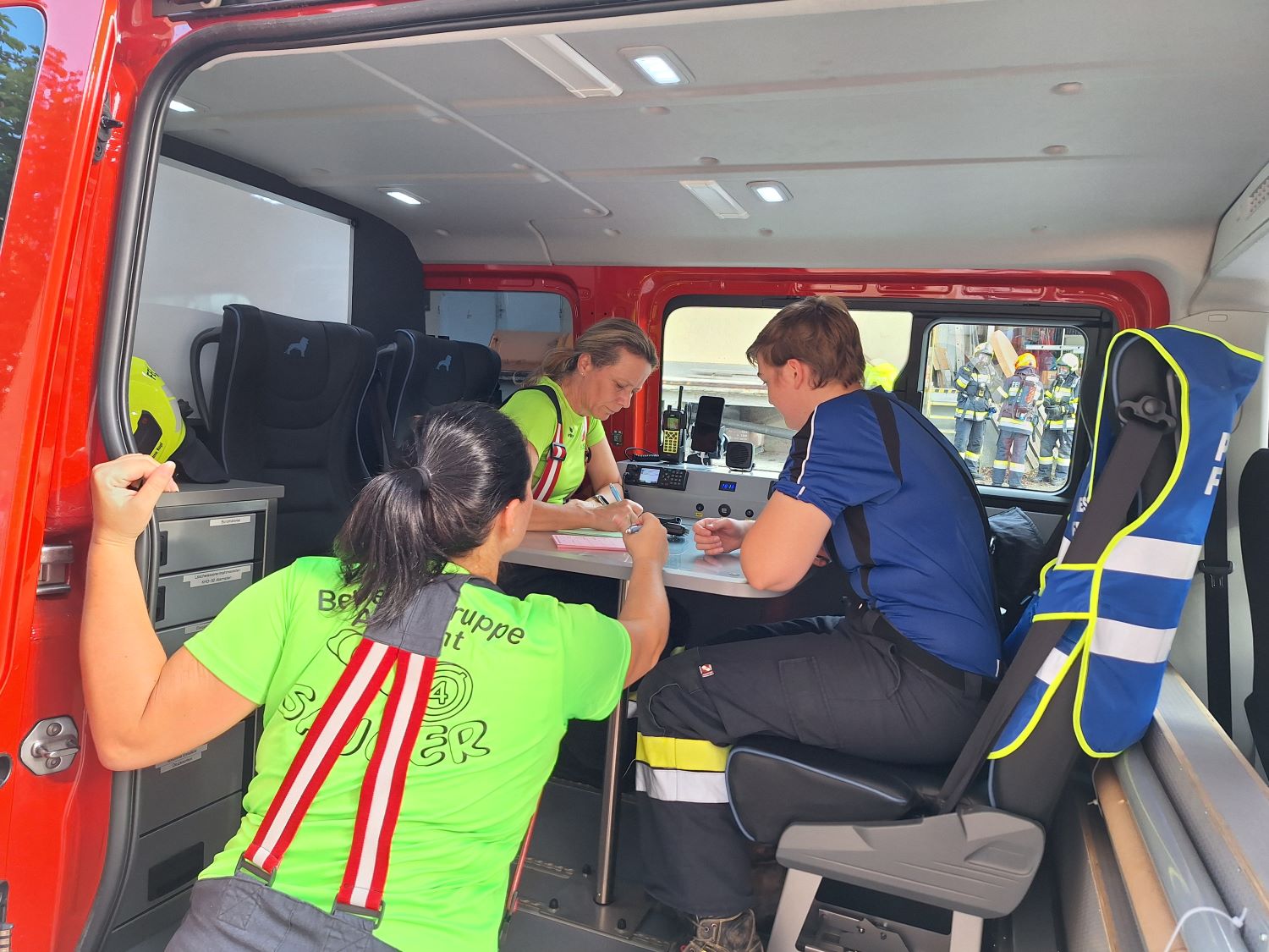 Aufgaben: Menschenrettung und Brandbekämpfung durch den Atemschutztrupp; Herstellung einer Zubringleitung vom stiftischen Löschteich, Aufbau einer Einsatzleitung, Übergabe der verunfallten Person an die SAN-Mannschaft.